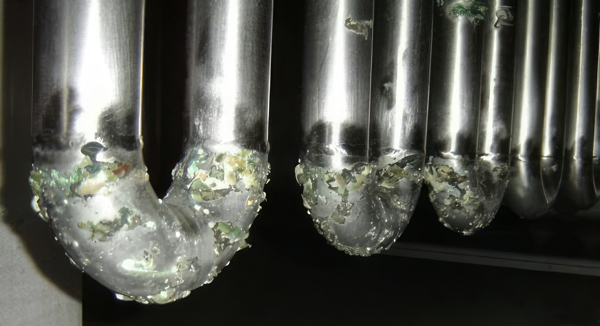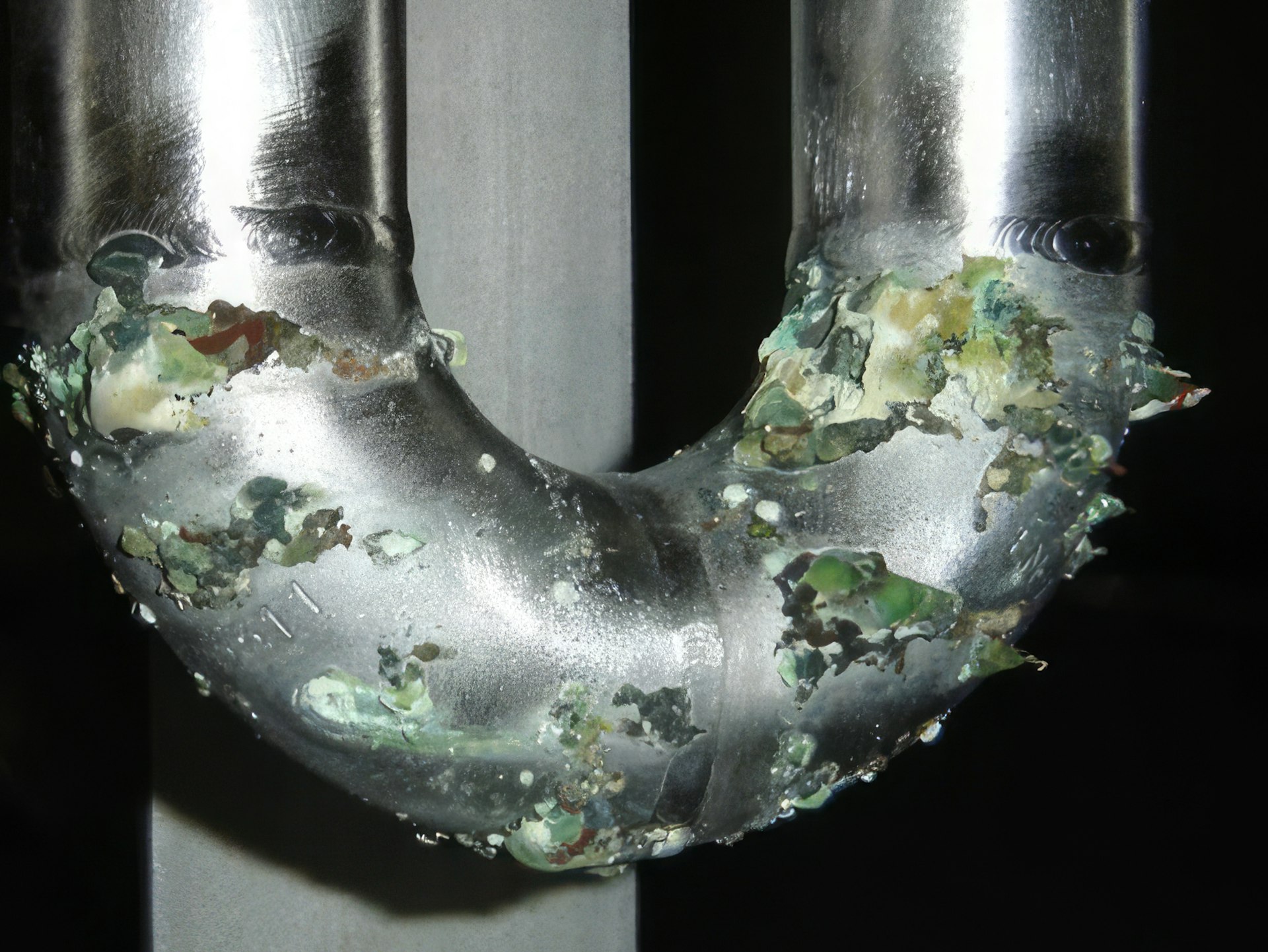 Die Ursache für diesen Schaden liegt in der Einführung von Salz (NaCl) und Eiweissen in das Phosphorsäurebad während des Reinigungsprozesses der Käsereiwerkzeuge. Da das Bad nicht regelmässig gereinigt oder ausgetauscht wurde, kam es zu einer Aufkonzentrierung dieser Verunreinigungen. Die Chloride im Bad machen die Phosphorsäure wesentlich aggressiver und führen zu einem Korrosionsangriff auf die geschweissten Rohre. Die entstehenden Korrosionsprodukte (Fe3+, Cr3+, Ni2+) bewirken eine Denaturierung der Eiweisse, die sich dann als Feststoff um die Lochfrassstelle herum ablagern. Die grüne und braune Verfärbung stammt von den im Eiweiss eingelagerten Korrosionsprodukten.